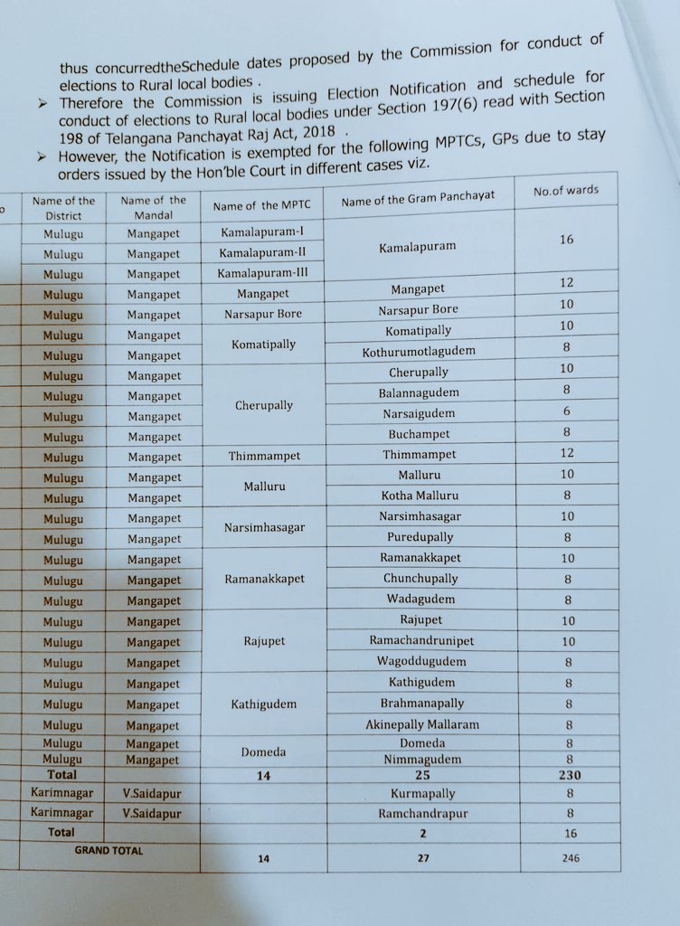 అలాగే ములుగు జిల్లాలోని 25 గ్రామ పంచాయతీలకు, కరీంనగర్లోని 2 గ్రామ పంచాయతీలకు ఎన్నికలు నిర్వహించడం లేదని రాష్ట్ర ఎన్నికల సంఘం ప్రకటించింది