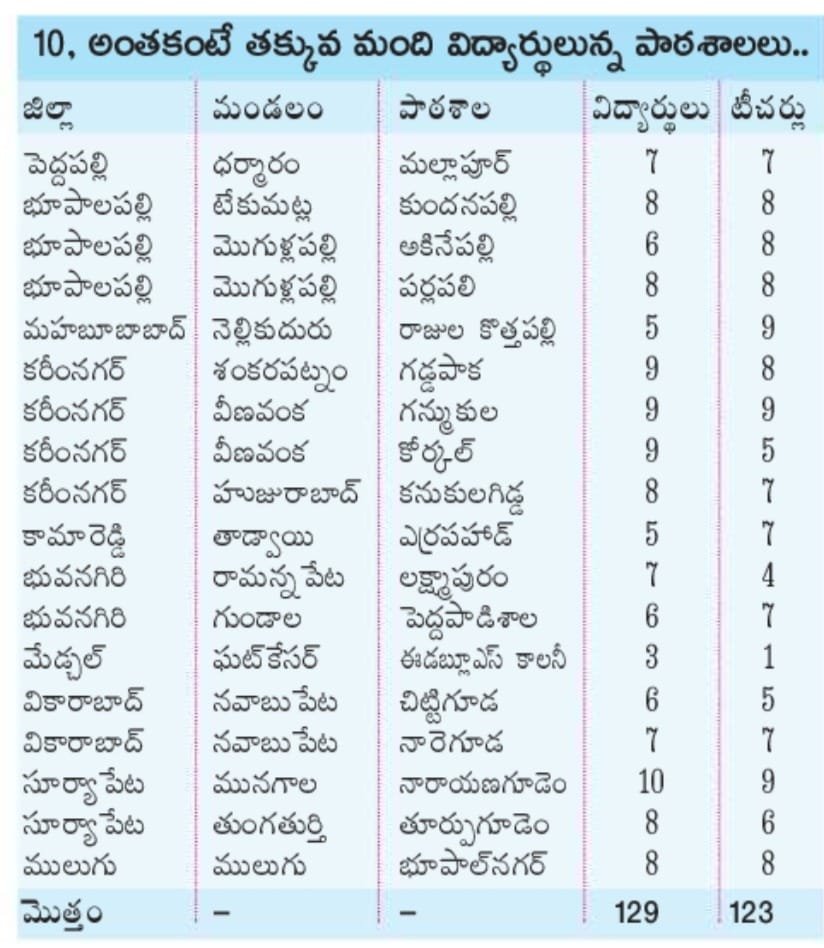 రాష్ట్ర వ్యాప్తంగా 4701 ఉన్నత పాఠశాలలో ఉండగా వాటిలో పదిలోపు విద్యార్థులు ఉన్న పాఠశాలలో 18 వరకు ఉన్నాయి. ఈ 18 పాఠశాలల్లో 129 మంది విద్యార్థులు మాత్రమే విద్యను అభ్యసిస్తున్నారు. ఈ పాఠశాలలో టీచర్ల సంఖ్య కూడా 129 కావడం విశేషం.